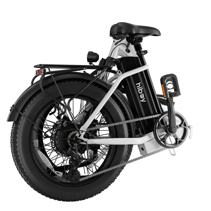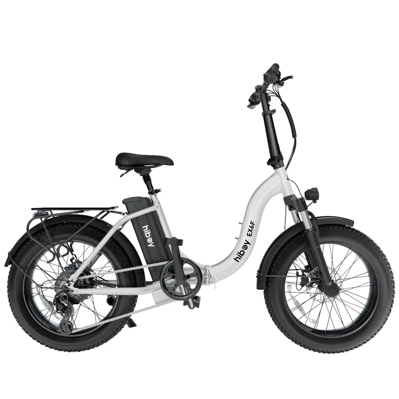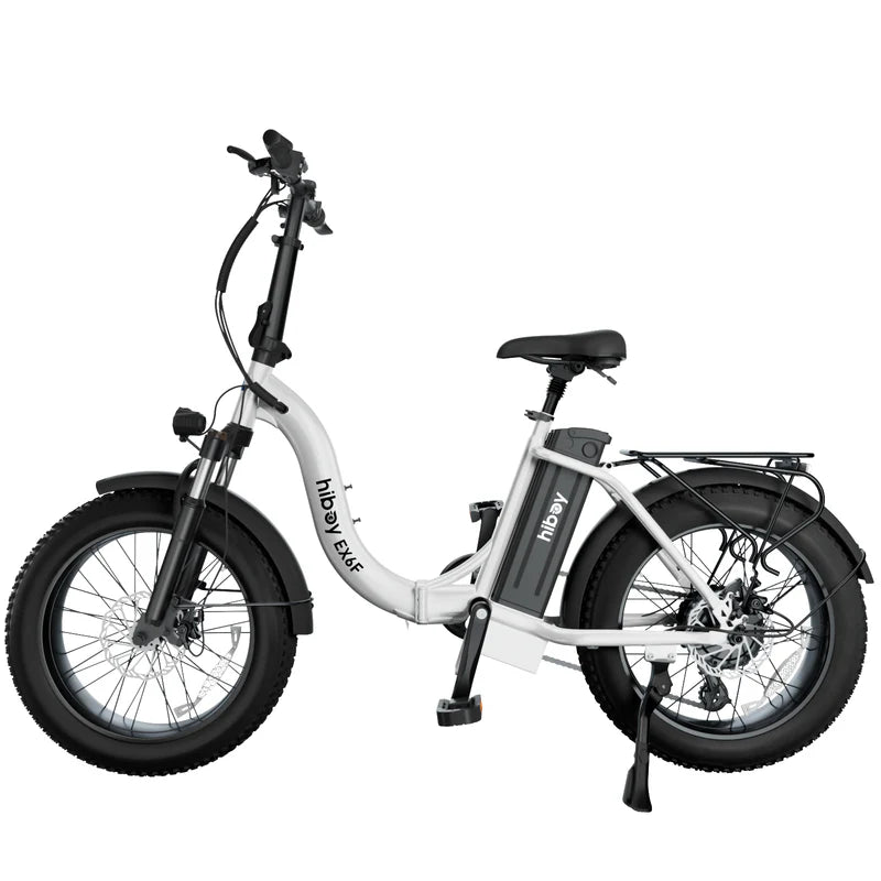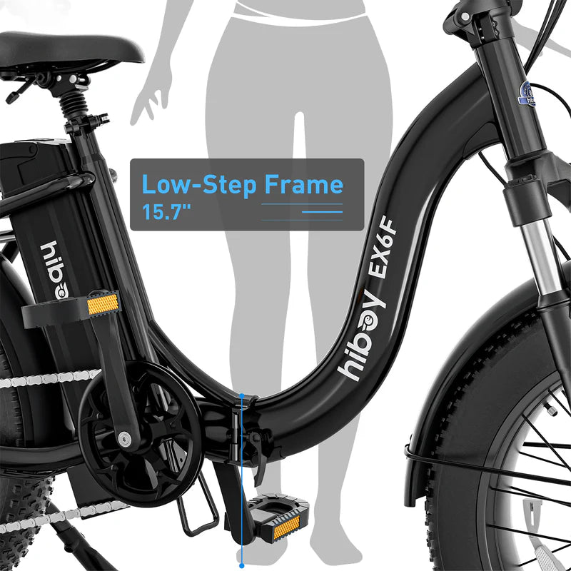 The Hiboy EX6F Low-Step Foldable Electric Bike offers a versatile ride with a UL 2849-certified 48V 14.5Ah battery delivering up to 75 miles of range. Its 750W peak motor effortlessly tackles city streets and hills. Designed for riders between 4'9" and 6'5", the adjustable handlebar and seat, combined with a low-step 15.7" frame, ensure an inclusive fit. The 3-point folding system and removable battery enhance portability and storage. Equipped with 20×4.0" fat tires, hydraulic front suspension, and a rear rack rated for 110 lbs, the EX6F is engineered for comfort, durability, and convenience on any journey.