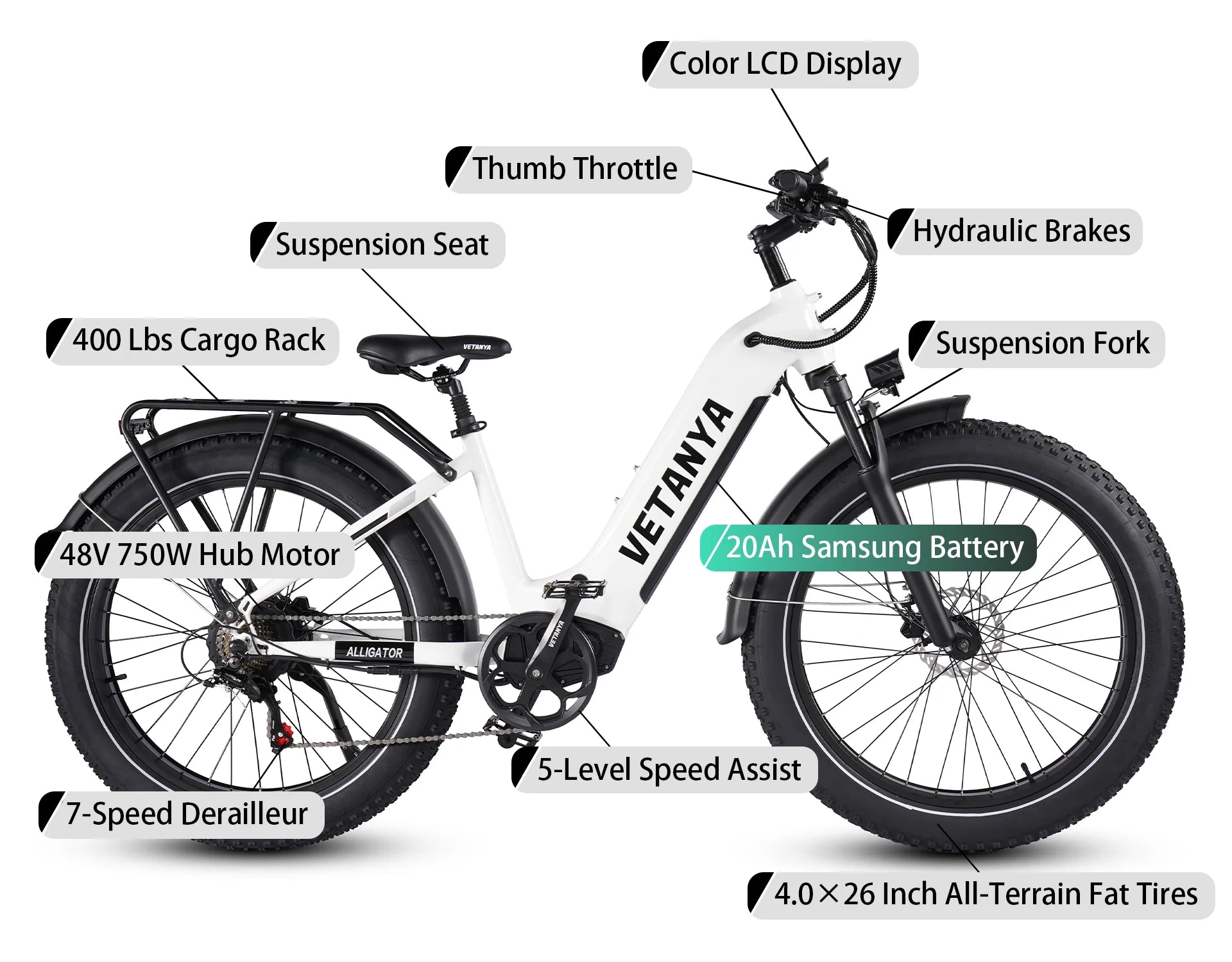 The VETANYA Alligator is a highly cost-effective long-range fat tire e-bike featuring a step-thru frame and a 20Ah Samsung lithium battery. It effortlessly conquers hills with hydraulic brakes and a powerful 750W motor, providing exceptional performance.